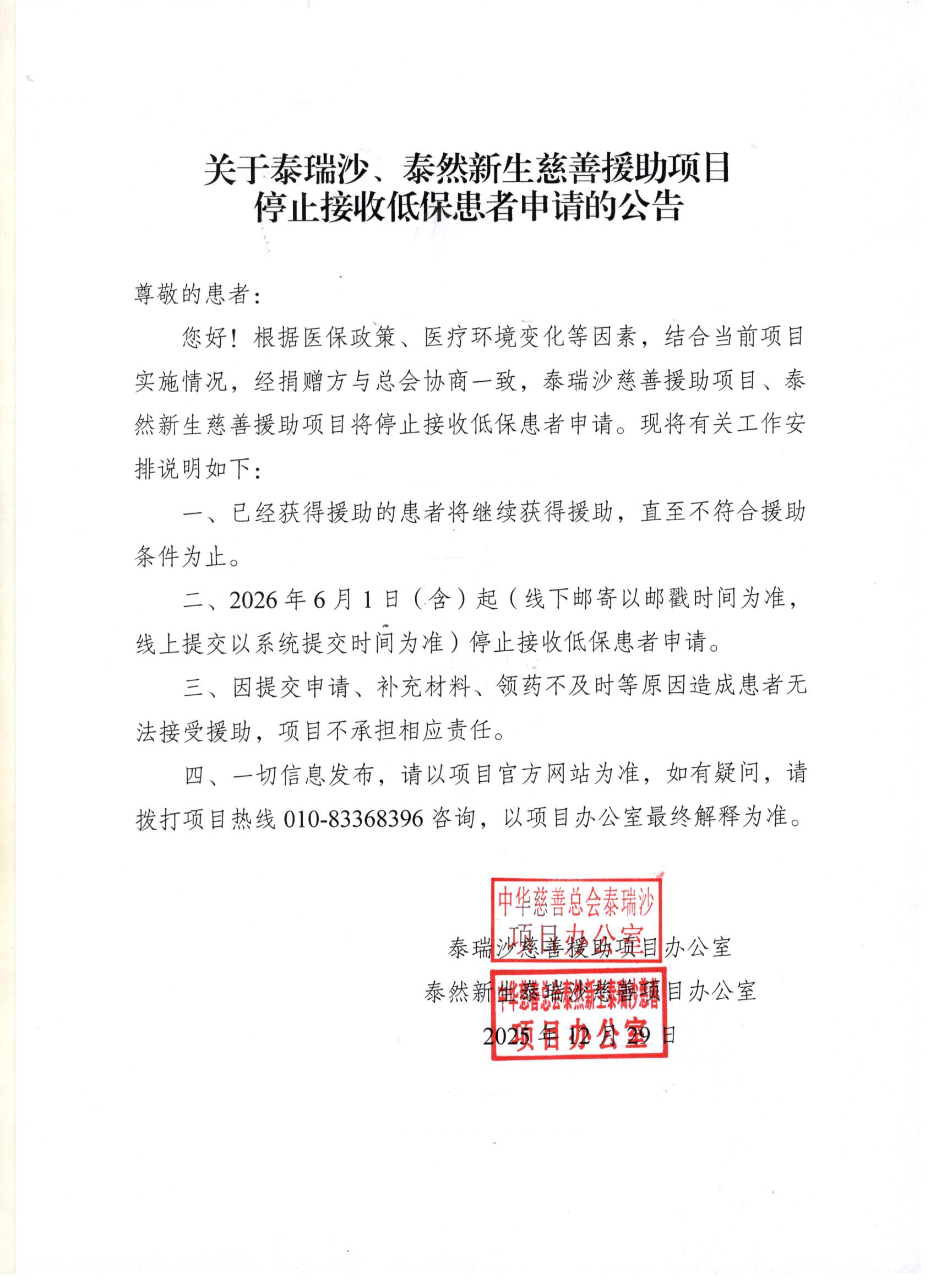 关于泰瑞沙、泰然新生慈善援助项目停止接收低保患者申请的公告