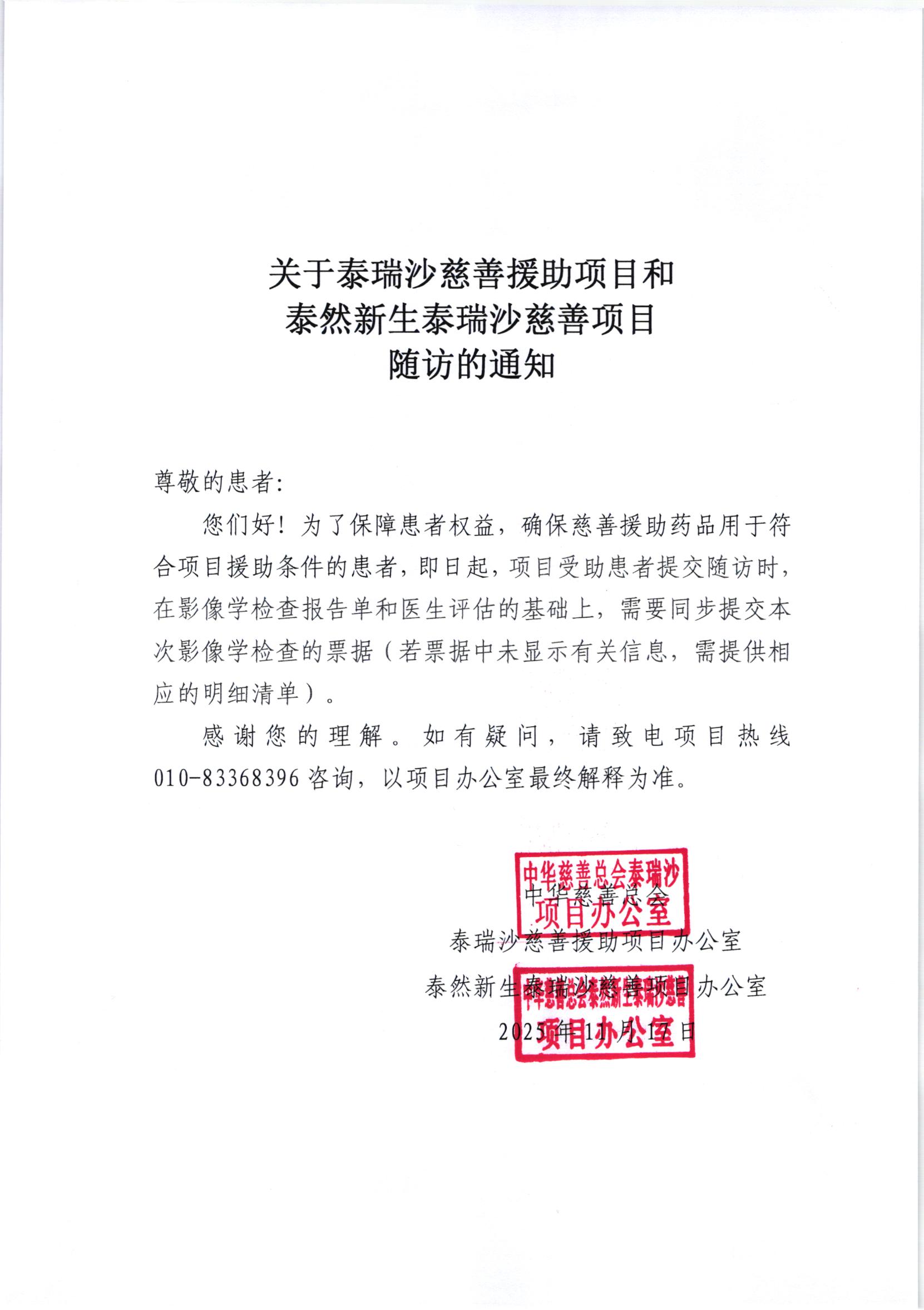 关于泰瑞沙慈善援助项目、泰然新生泰瑞沙慈善项目随访的通知