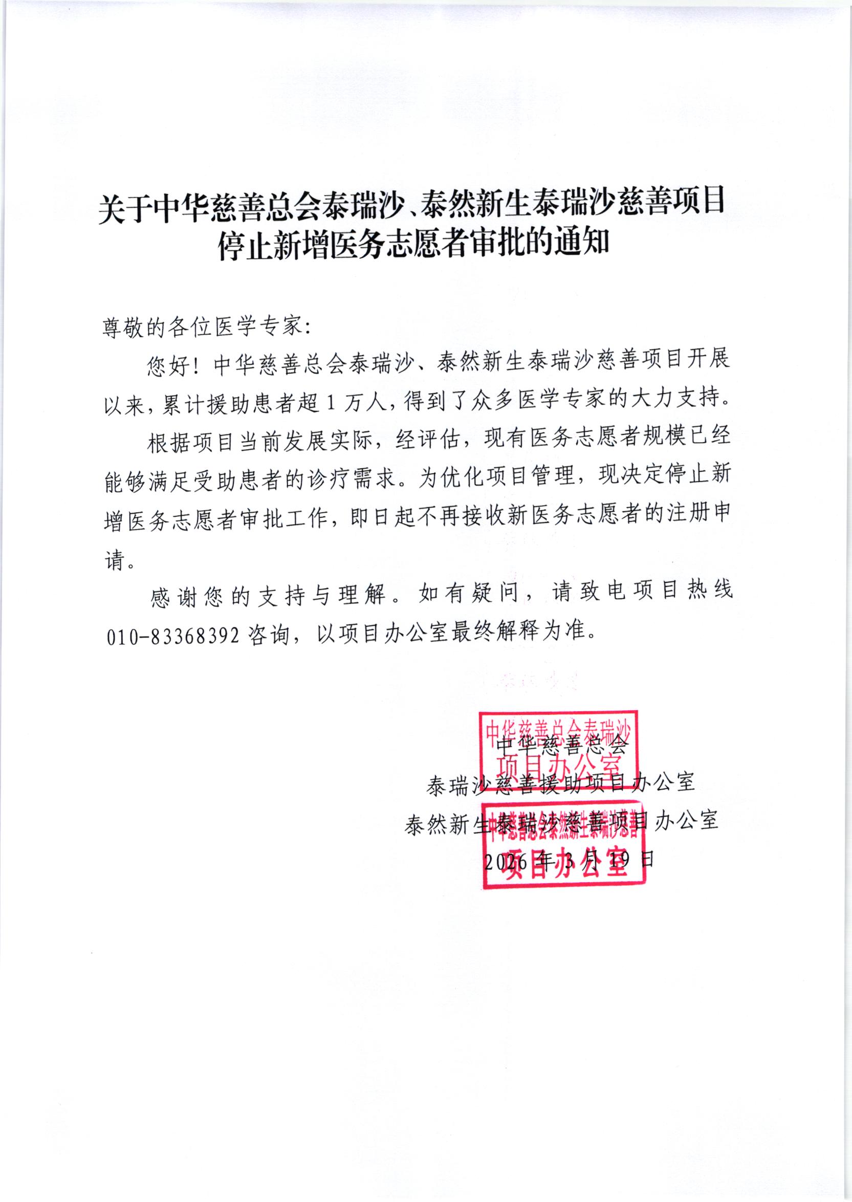 关于泰瑞沙、泰然新生泰瑞沙慈善项目停止新增医务志愿者审批的通知